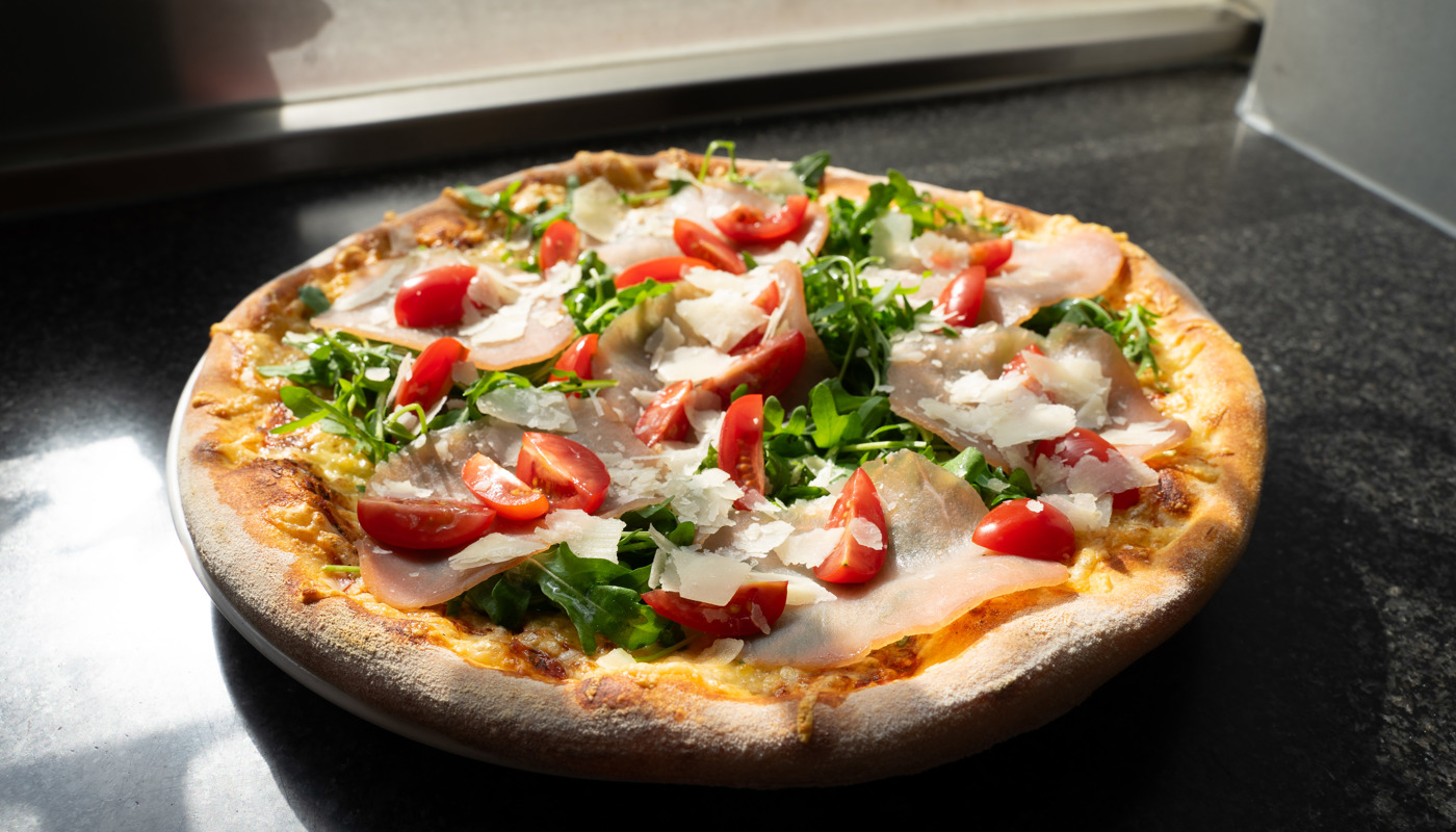 tomatensaus, mozzarella, ham en verse pesto. Groot (+/- 32cm) - €13,50, Klein (+/- 27cm) - €12,50
