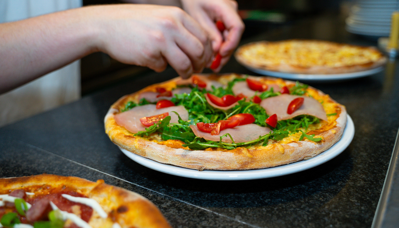tomatensaus, kaas, champignons, paprika, ham, ui en pepers. Groot (+/- 32cm) - €13,50, Klein (+/- 27cm) - €12,50