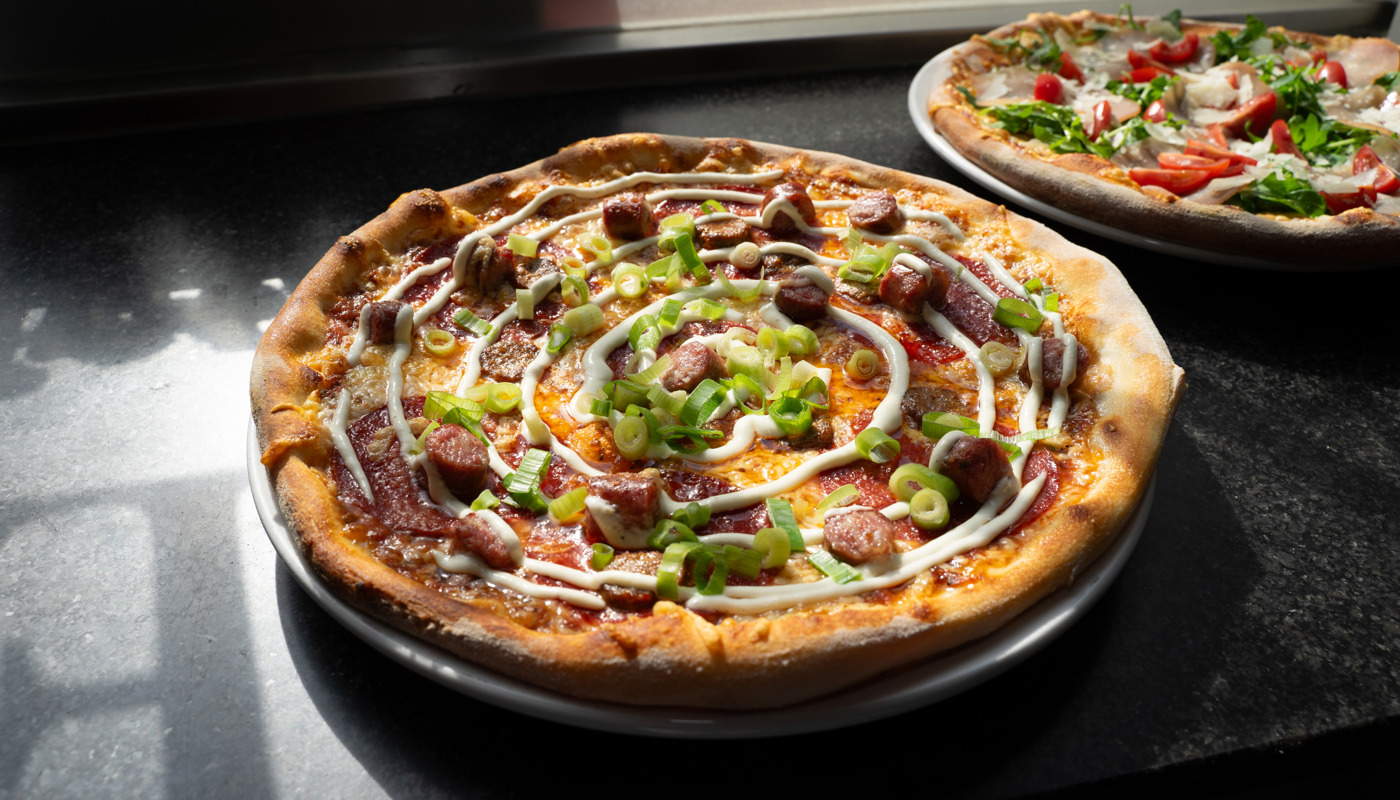 afgemaakt met crème fraîche en lente ui. Groot (+/- 32cm) - €16,50, Klein (+/- 27cm) - €15,50